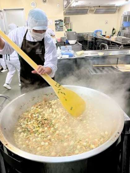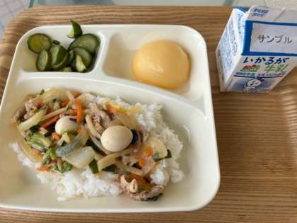 今日の献立の中華丼は、豚肉、うずら卵、はくさい、たまねぎ、たけのこ、にんじん、にら、しょうが、しいたけが入っています。この献立はうずら卵を除去した個別対応献立になります。たくさんの具材の旨みが合わさって、とてもおいしい一品でした。