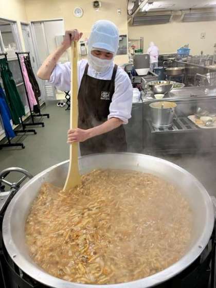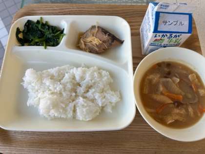 今日の献立のなめこのみそ汁は、じゃがいも、うすあげ、だいこん、にんじん、なめこが入った具沢山のみそ汁です。素材の味が合わさって、とてもおいしい一品でした。