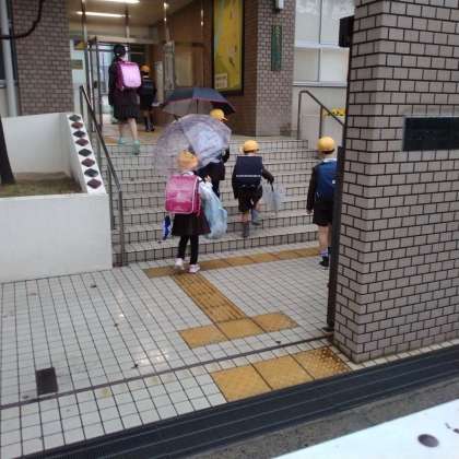 登校風景です。小雨のなかの登校になりました。