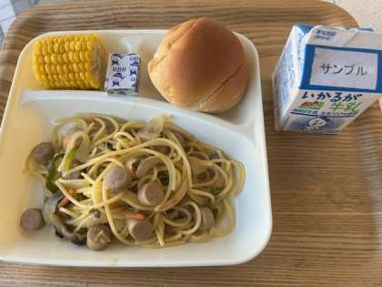 今日の献立のウインナーときのこの和風スパゲッティは、ウインナー、ベーコン、たまねぎ、にんじん、ピーマン、にんにく、しいたけ、しめじが入ったしょうゆベースの和風スパゲッティでした。具沢山でボリュームがあり、あっさりと食べやすく、とてもおいしい一品でした。