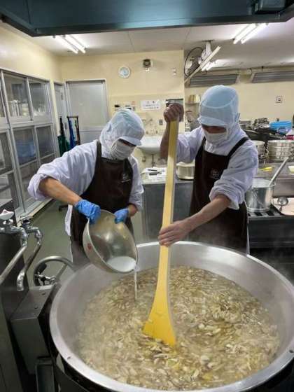 うすくず汁は、鶏肉、さといも、はくさい、だいこん、たまねぎ、みつば、しいたけが入った汁ものです。水溶きでんぷんでとろみをつけています。だしこんぶとけずりぶしのだしに、たくさんの素材の味が合わさって、とてもおいしい一品でした。