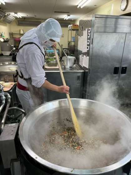 今日の献立のさごしのごまじょうゆかけは、塩で下味をつけたさごしを焼物機で焼き、料理酒、みりん、うすくちしょうゆ、いりごまを合わせたタレをかけています。ごはんによく合う、とてもおいしい一品でした。