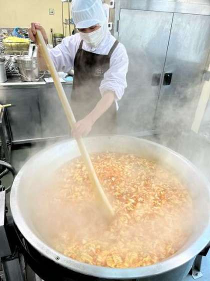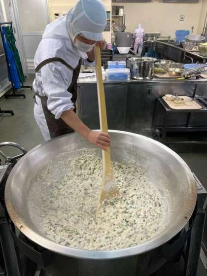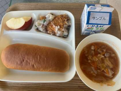 今日の献立のきのこのドリアは、しめじ、エリンギ、マッシュルームという3種類のきのこと、ベーコン、たまねぎ、グリンピースが入っています。牛乳とクリームのコクがしっかりと感じられる、とてもおいしい一品でした。