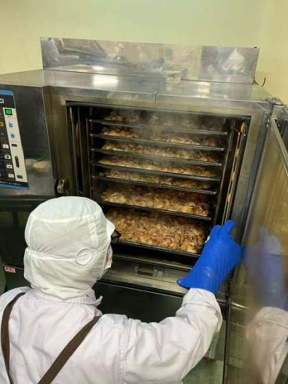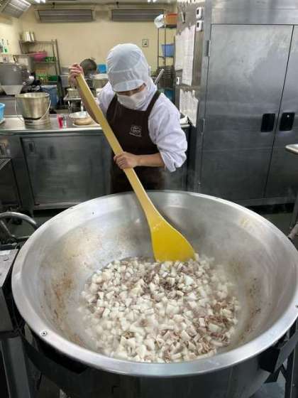 今日の献立の鶏肉の甘辛焼きは、鶏肉に料理酒、砂糖、みりん、こいくちしょうゆで下味をつけ、たまねぎを混ぜ合わせてから焼物機で焼いています。鶏肉とたまねぎがとてもよく合い、とてもおいしい一品でした。