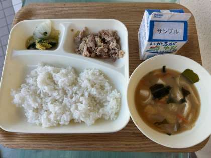 みそ汁はにぼしでだしをとり、とうふ、うすあげ、たまねぎ、にんじん、わかめが入っています。