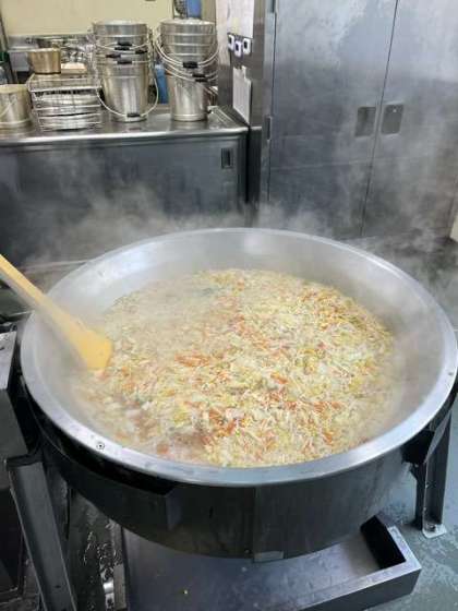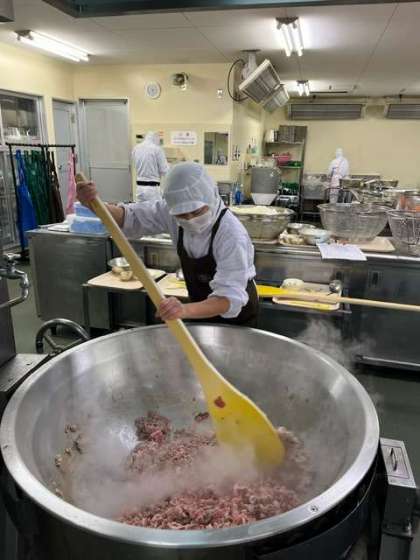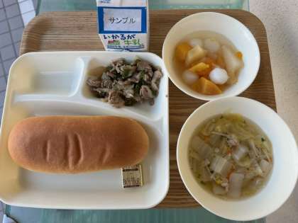今日の献立の豚肉と野菜のソテーは、豚肉とたまねぎ、ピーマンをいため、塩、こしょう、ウスターソースで味付けをしています。ウスターソースのコクが感じられる、食べやすくおいしい一品でした。