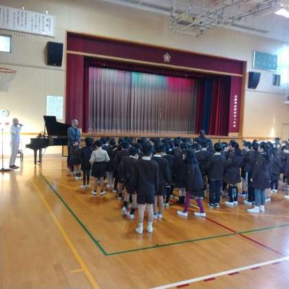 校長先生のお話がありました。また、校歌を元気いっぱい歌いました。