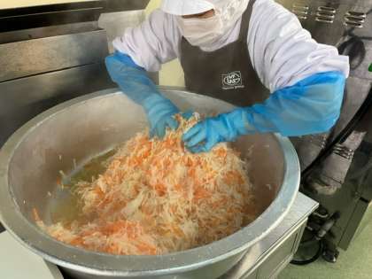 紅白なますは、おせち料理の一品です。焼物機で蒸しただいこんとにんじんに、砂糖、塩、米酢、うすくちしょうゆを合わせた調味液をかけてあえています。さっぱりとしていて食べやすい一品でした。