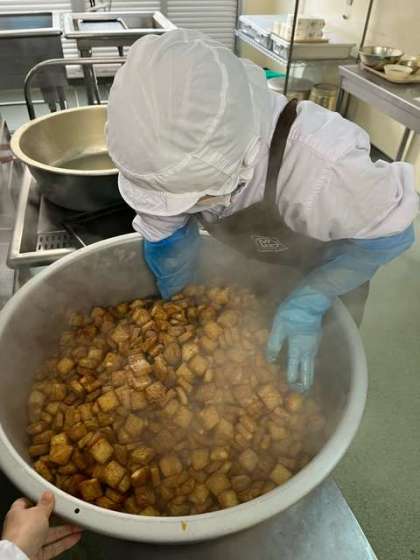 あつあげのピリ辛じょうゆかけは、焼物機で焼いたあつあげに、砂糖、こいくちしょうゆ、トウバンジャンで作ったタレをかけています。こちらも、トウバンジャンの風味がほのかに感じられる、とてもおいしい一品でした。