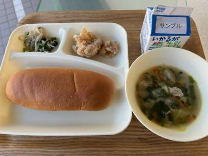 今日の献立の鶏肉のからあげは、先日南津守小学校全校生徒の好きなおかずダントツの1位の献立です。鶏肉にしょうが、にんにくなどで下味をつけ、でんぷんをまぶして風味よくあげています。外はからりとあがり中はジューシーで、とてもおいしい一品でした。