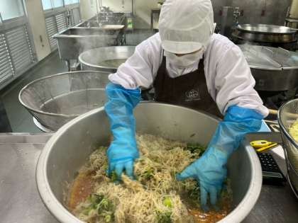 チンゲンサイともやしの甘酢あえは、ゆでたチンゲンサイと焼物機で蒸したもやしに、砂糖、米酢、うすくちしょうゆで作ったタレをかけてあえています。からあげによく合う副菜で、さっぱりとしていてとてもおいしい一品でした。