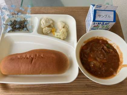 今日の献立のビーフシチューは、小麦粉と綿実油でルウを作ります。しっかりと褐色に色づくまで十分炒めてルウを作っています。牛肉、じゃがいも、たまねぎ、にんじん、グリンピースが入った、具沢山でとてもおいしい一品でした。