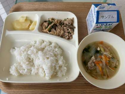今日の献立の豚肉と干しずいきのみそ煮は、豚肉、うすあげ、干しずいき、青ねぎを使用し、砂糖、みりん、赤みそ、こいくちしょうゆで味付けして煮ています。干しずいきはさといもの葉柄のことで、カルシウムや鉄、食物繊維が多く含まれています。昔から食べられてきた乾物の一つです。『豚肉と一緒にはいってたやつ、なんて言うん?シャキシャキして、めっちゃ美味しかった!』という児童の声も聞かれました。ぜひ、食べ継いでいって欲しいと思います。