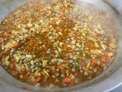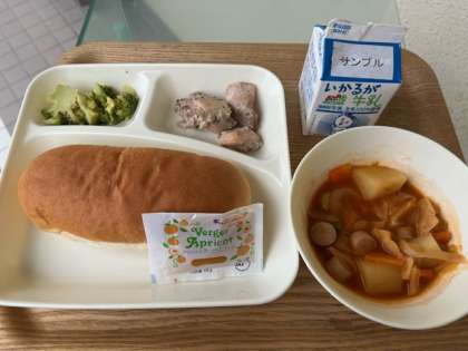 ウインナーと野菜のケチャップ煮は、ウインナー、じゃがいも、たまねぎ、キャベツ、にんじん、グリンピースが入った洋風の煮ものです。食べやすく、こちらもおいしい一品でした。