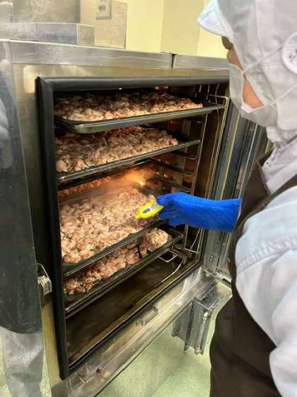 今日の献立の鶏肉のバジル焼きは、鶏肉をワイン、塩、粗挽こしょう、バジル、オリーブ油で下味をつけ、焼物機で焼いています。バジルとオリーブ油の相性が良く、とてもおいしい一品でした。