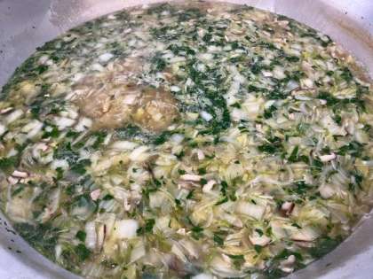 うすくず汁は、鶏肉、はくさい、だいこん、たまねぎ、しいたけ、みつばが入っています。だしこんぶとけずりぶしのだしの味がしっかりと感じられる、ほどよいとろみがついた