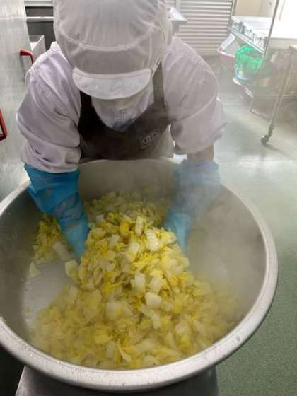 今日の献立のはくさいのゆず風味は、焼物機で蒸したはくさいに砂糖、塩、うすくちしょうゆ、ゆず果汁で作った調味液を加えてあえています。ゆずの風味がさわやかで、とてもおいしい一品でした。