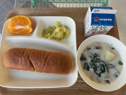 今日の献立のほうれんそうのクリームシチューは、小麦粉と綿実油でホワイトルウを作り、牛乳とクリームでコクを出しています。鶏肉、じゃがいも、たまねぎ、にんじん、ほうれんそう、エリンギが入った具沢山でとてもおいしい一品でした。