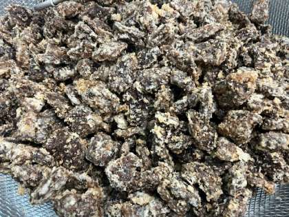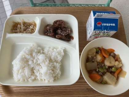 今日の献立のくじらのたつたあげは、じゃがいもでんぷんの衣がついた味のついたくじらを、170度のなたね油で揚げています。衣はサクサクで、とても食べやすくおいしい一品でした。