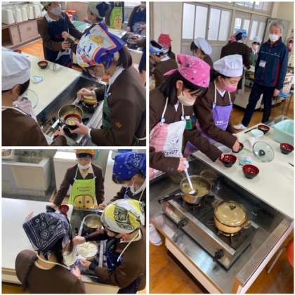 5年生は家庭科の時間に、ご飯とみそ汁の調理実習を行いました。
