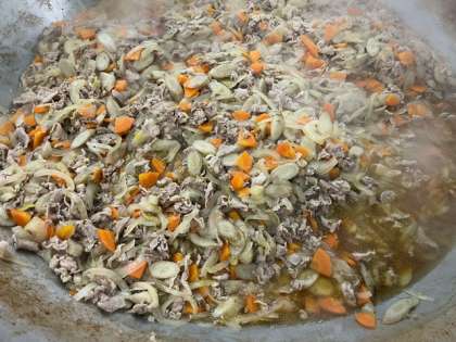 今日の献立の豚肉とごぼうの煮ものは、豚肉、たまねぎ、ごぼう、にんじんを甘辛く味付けした煮ものです。素材の味がしっかりと感じられる優しい味の一品でした。