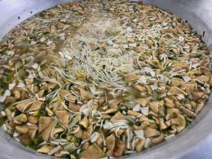 なにわうどんは、かまぼこ、味付けしたうすあげ、はくさい、青ねぎが入ったうどんです。食べる時に1人1袋ずつ、きざんだとろろこんぶをかけていただきます。温かく、こちらもおいしい一品でした。