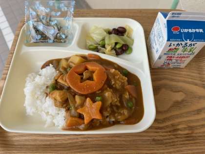 今日の献立のチキンカレーライスは、鶏肉、じゃがいも、たまねぎ、にんじん、グリンピース、にんにくが入っています。食べやすくて、とてもおいしい一品でした。