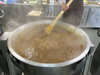 ビーンズサラダは、ドライパックの金時豆、むきえだまめ、キャベツが入っています。砂糖、塩、こしょう、米酢、うすくちしょうゆ、綿実油を使ったドレッシングを使って、あえています。程よい酸味がカレーによく合い、こちらもおいしい一品でした。