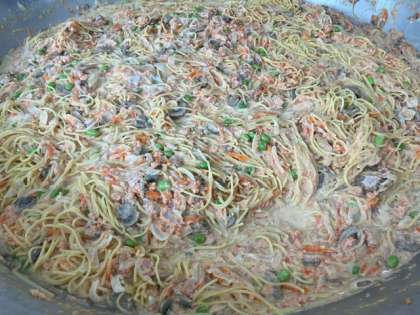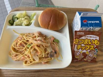 今日の献立のさけのクリームスパゲッティは、紅ざけフレーク、ベーコン、たまねぎ、にんじん、むきえだまめ、マッシュルームが入ったクリームスパゲッティです。紅ざけの色が、とても春らしい淡いピンク色で、見て楽しく、食べておいしい一品でした。
