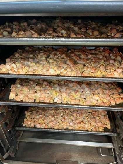今日の献立のまぐろの甘辛焼きは、砂糖、みりん、こいくちしょうゆ、綿実油で下味をつけたまぐろと白ねぎを混ぜ合わせ、焼物機で焼いています。甘辛い味がごはんによく合う、とてもおいしい一品でした。