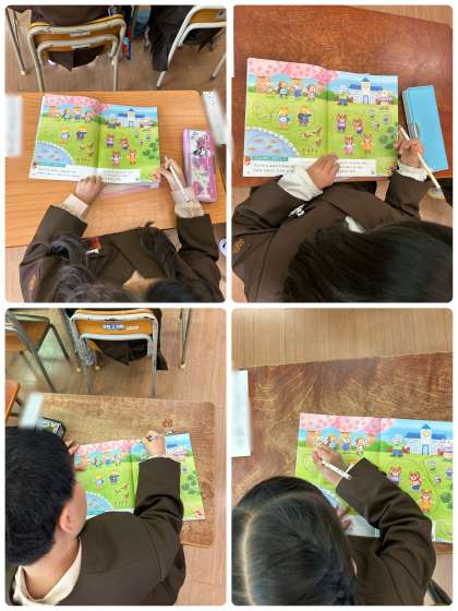 今日の国語では、初めて鉛筆を持ち、自分の名前を書きました!机に貼っている名前を見て上手にうつすことができました。