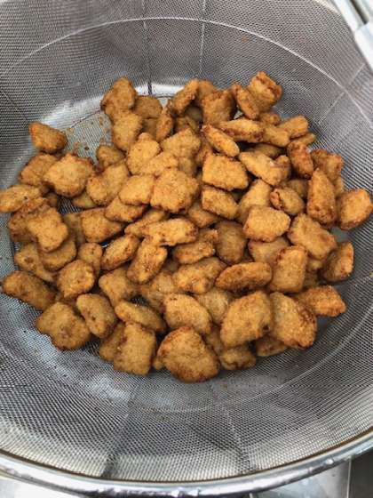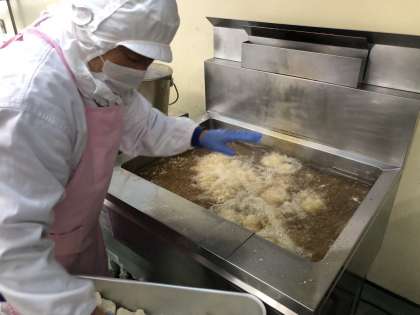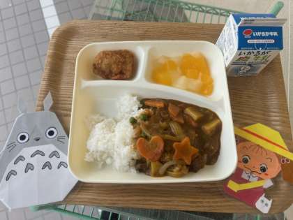 そこに、一口トンカツは1人1つずつのせていただきます。トンカツは、170度のなたね油で衣をからりと揚げています。とてもおいしい一品でした。1年生のみなさんも、『おいしかったよー!』『いつも給食残しちゃうんやけど、今日は全部食べれたよ!』『緑の丸いやつ(グリンピース)、嫌いやねんけど、今日は食べれてん!』と、素敵な笑顔で教えてくれました。