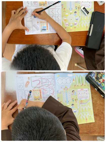 今日からひらがなの学習が始まりました!「つ」と「く」でしたが、上手に書くことができ、「つ」や「く」のつく言葉をたくさん見つけることができました!