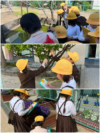 花や木、虫やカメなど、たくさんの生き物を見つけて絵を描きました。