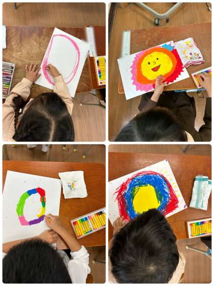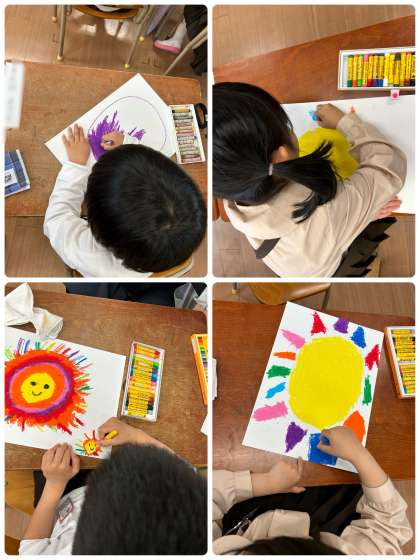 今日は一年生になって初めて絵を描きました!「わたしのおひさま」で自分が思うおひさまを描きましたが、1人ひとり違ってとても面白かったです。また、クレヨンを使いましたが、紙が見えないくらい上手に塗りつぶすことができました!