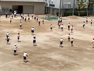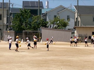 3時間目、2年生は運動場でボールを使って元気よく活動しました。