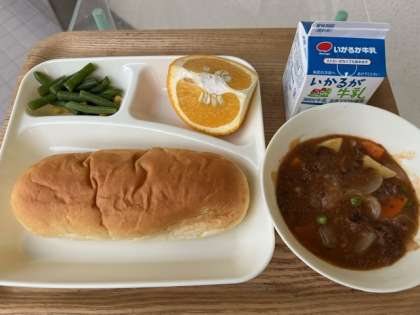 今日の献立のビーフシチューは、ケチャップ、トマトピューレ、トンカツソース、ウスターソース、チキンブイヨンなどで味付けし、上新粉でとろみをつけて煮込んでいます。今年度から、小麦アレルギーの人でも食べられるように、とろみをつけるのに小麦粉ではなく上新粉を使っています。優しい味わいの、とてもおいしい一品でした。