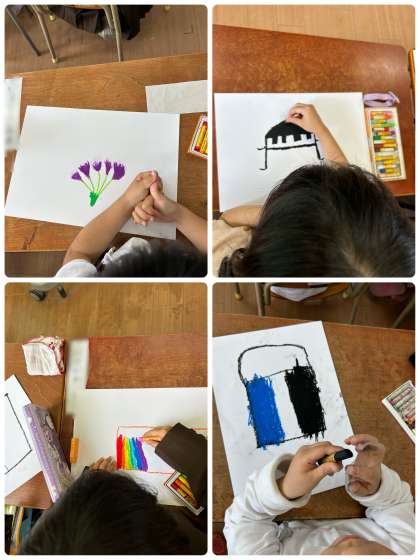 国語の学習で学校探検で見つけたものや教室にあるもので友だちに紹介したいものを決め、クイズを出しながらみんなで答える学習をしています。クイズ形式のため、横の友だちに分からないように隠しながら絵を描いている子どもたち!入学してから1か月、学校のたくさんのものを見つけることができるようになりましたね!