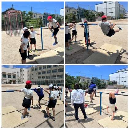 今日は、「足かけ周り」を特訓しました。振り子の要領で勢いをつけて上がるのですが、これがなかなか難しいんです^^;