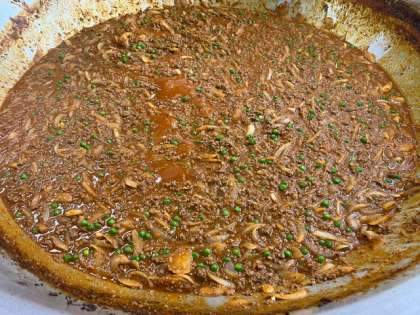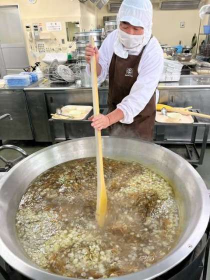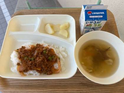 今日の献立のタコライスは、沖縄料理のひとつです。牛ひき肉、豚ひき肉、たまねぎ、グリンピース、にんにくが入っています。カレー粉、ケチャップ、ウスターソースなどで味付けしています。ごはんの上にかけていただきます。どのクラスも、しっかりと食べていました。