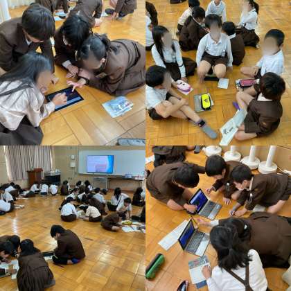 子どもたちは、グループで水そうにいる生き物たちを観察し、気付いたことワークシートに記入していきます。また、2か所のポイントを通過しながら時間を確認しながらゴールを目指す活動をします。グループ活動では、オリエンテーションに向けて、リーダーを決めたり、時計係を決めたりとみんなで意見を出し合って取り組んでいました。また、パソコンを使ってグループで観察したい生き物を決めました。みんなで協力し合いながら話している姿やパソコンで調べる様子はさすが4年生だなと実感しました。