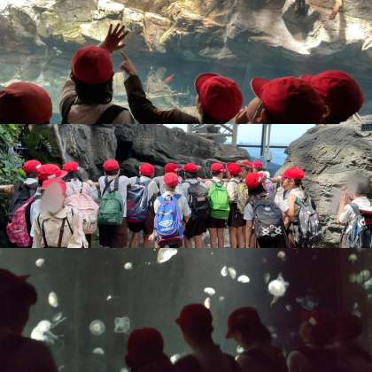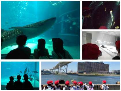 オリエンテーションでは、事前指導でも話をした「グループで時間を守り、協力して、楽しむこと」ができていました。大きな水槽には、ジンベイザメやペンギン、アザラシなど、たくさんの生き物がいました。ゆらゆら揺れているいろんな種類のクラゲがいて驚きましたね。みんな夢中になって見ていました!子どもたちは、はぐれそうになった時に友だち同士で声を掛け合ってる姿が見られ、さすが4年生だなと実感しました。みんなで活動できて楽しかったですね♪そのあとはお弁当を食べて、「日本一小さい山」に登りました。