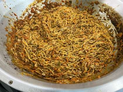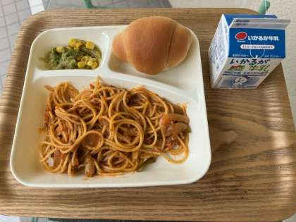 今日の献立のミートソーススパゲッティは、牛ひき肉、豚ひき肉、たまねぎ、にんじん、ピーマン、にんにく、マッシュルームが入ったスパゲッティです。上新粉でとろみをつけています。とても食べやすく、おいしい一品でした。