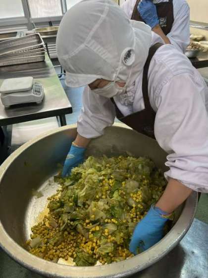 レタスとコーンのサラダは、生のレタスとコーンを焼物機で蒸し、砂糖、塩、米酢、うすくちしょうゆ、綿実油で作ったドレッシングであえています。さっぱりとしていて食べやすく、レタスの食感が心地よいおいしい一品でした。