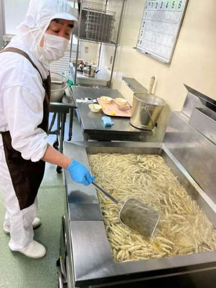 今日の献立のきびなごてんぷらは、衣のついたきびなごを170度の油でからりとあげています。衣はサクサクで、とてもおいしい揚げあがりでした。