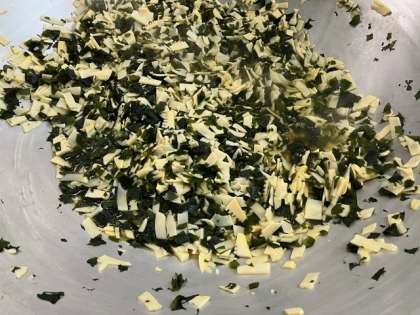 わかたけ煮は、春に収穫されるたけのことわかめを使った一品です。今日のわかめは、三陸産のわかめを使っています。1年生の児童のみなさんからも、『今日のたけのことわかめ、めっちゃおいしい!!』や、『たけのこ、だしの味がしておいしい!』といった声がたくさん聞かれました。
