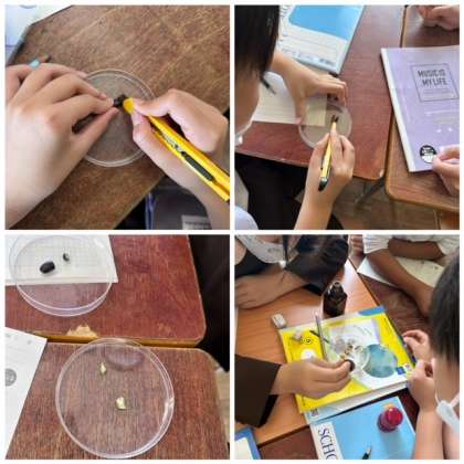 この日は、発芽した種子にはでんぷん(栄養)があるのだろうかを確かめる実験を行いました。ヨウ素液を慎重に垂らして反応を確かめていました。