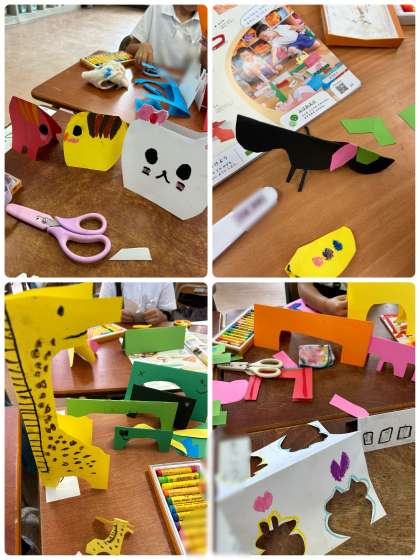 紙の切り方を工夫しながら、トンネルや動物など、思い思いの作品を作ることができました!