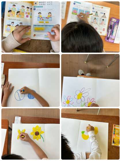 たしざんの学習が始まりました!「あわせて」「ぜんぶで」「ふえると」が出てくると、たしざんだと気づくことができています!学習する喜びを感じてきたようで、「もっとたしざんをしたい!」や「できる!」と目を輝かせています!たしざんの学習のまとめとして、たしざん絵本を作成しました♪