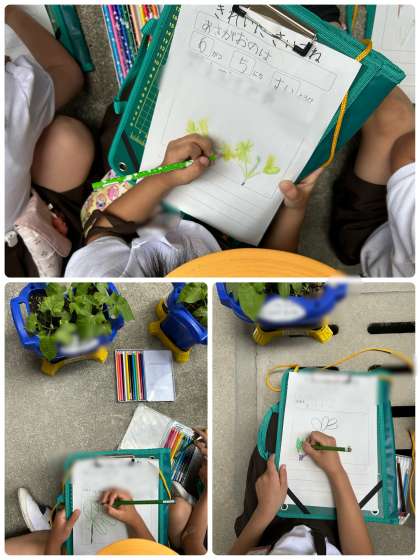 あさがおの観察では、観察カードを書いています。種を植えた後、毎日お水をあげていたら「ふたば」が出てきました。その後、「ほんば」が出てきました。今週は弦が伸びてくるので、支柱を立てます。また、その様子もお伝えします♪